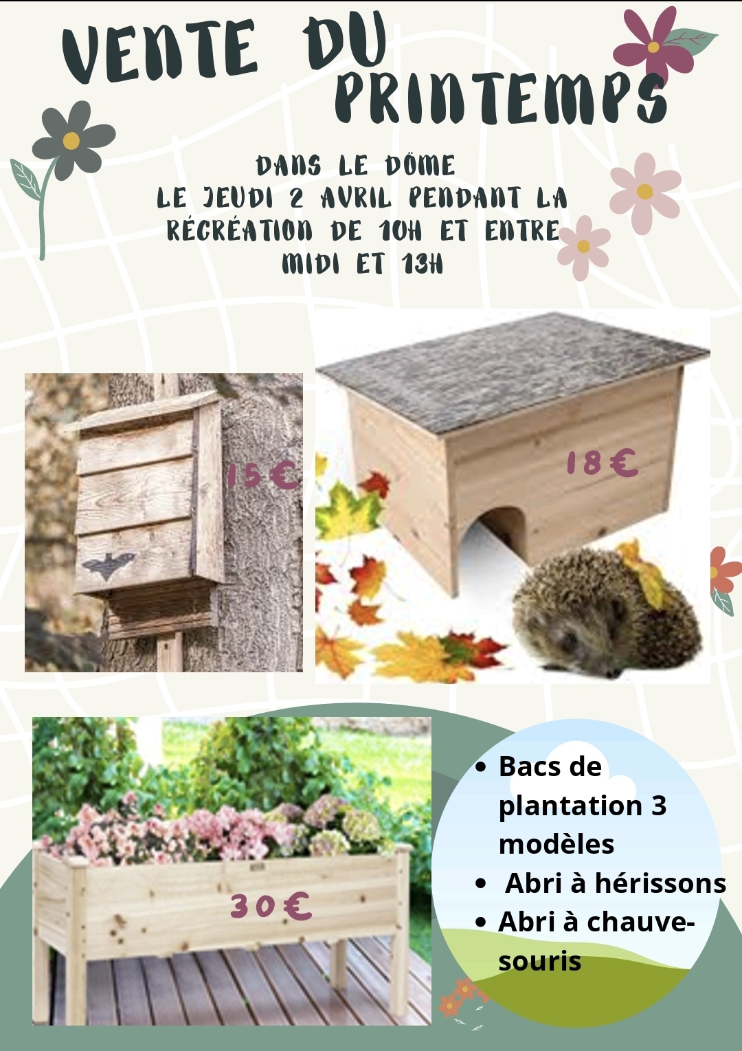 Nous vous proposerons différents articles confectionnés par les élèves : porte-clés en résine (3,5€), bacs de plantation (30€) , abris pour animaux (entre 15€ et 18€), etc...
