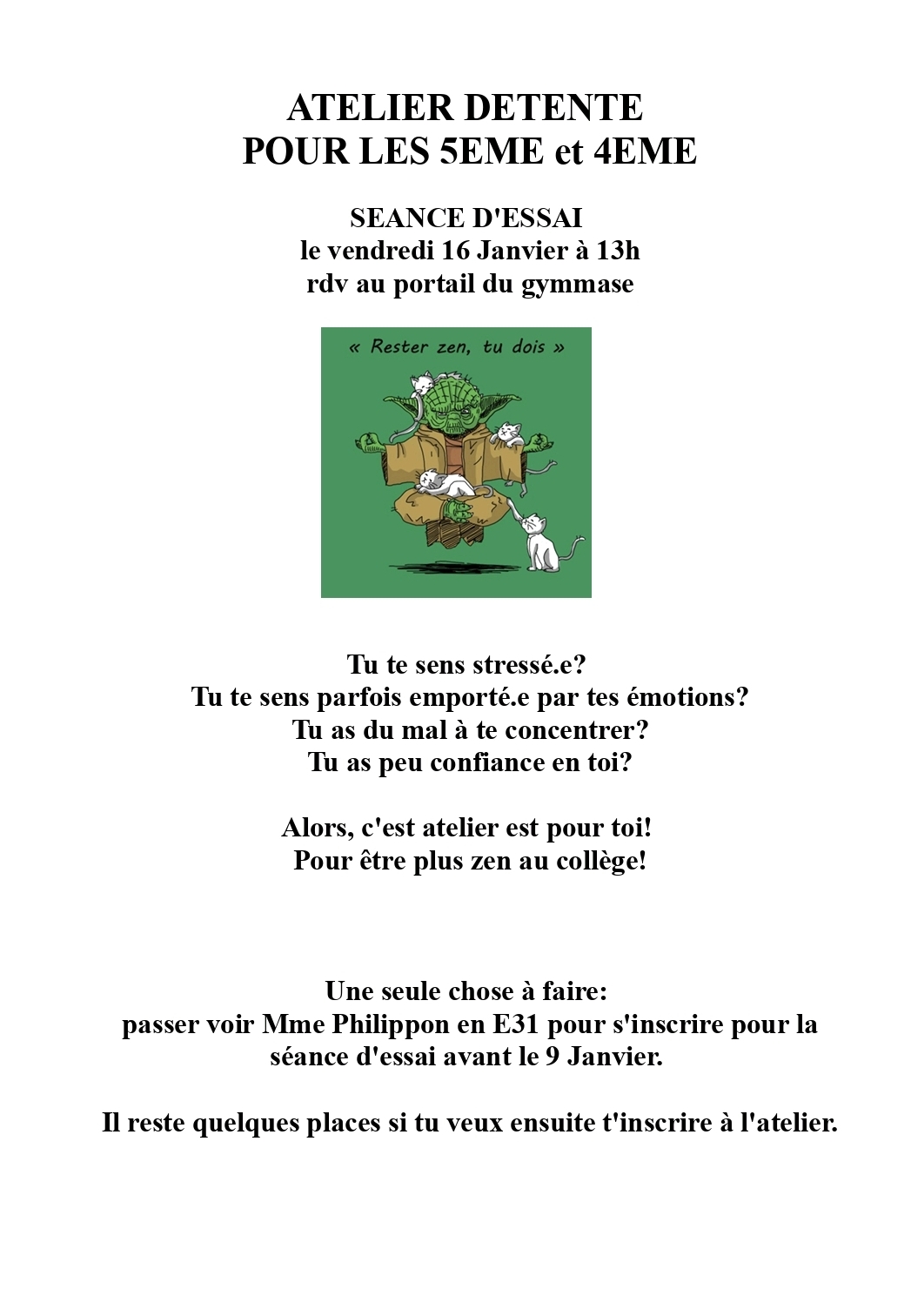 L'atelier détente avec Mme Philippon commence le 16 Janvier à 13h pour les 5ème et 4ème.