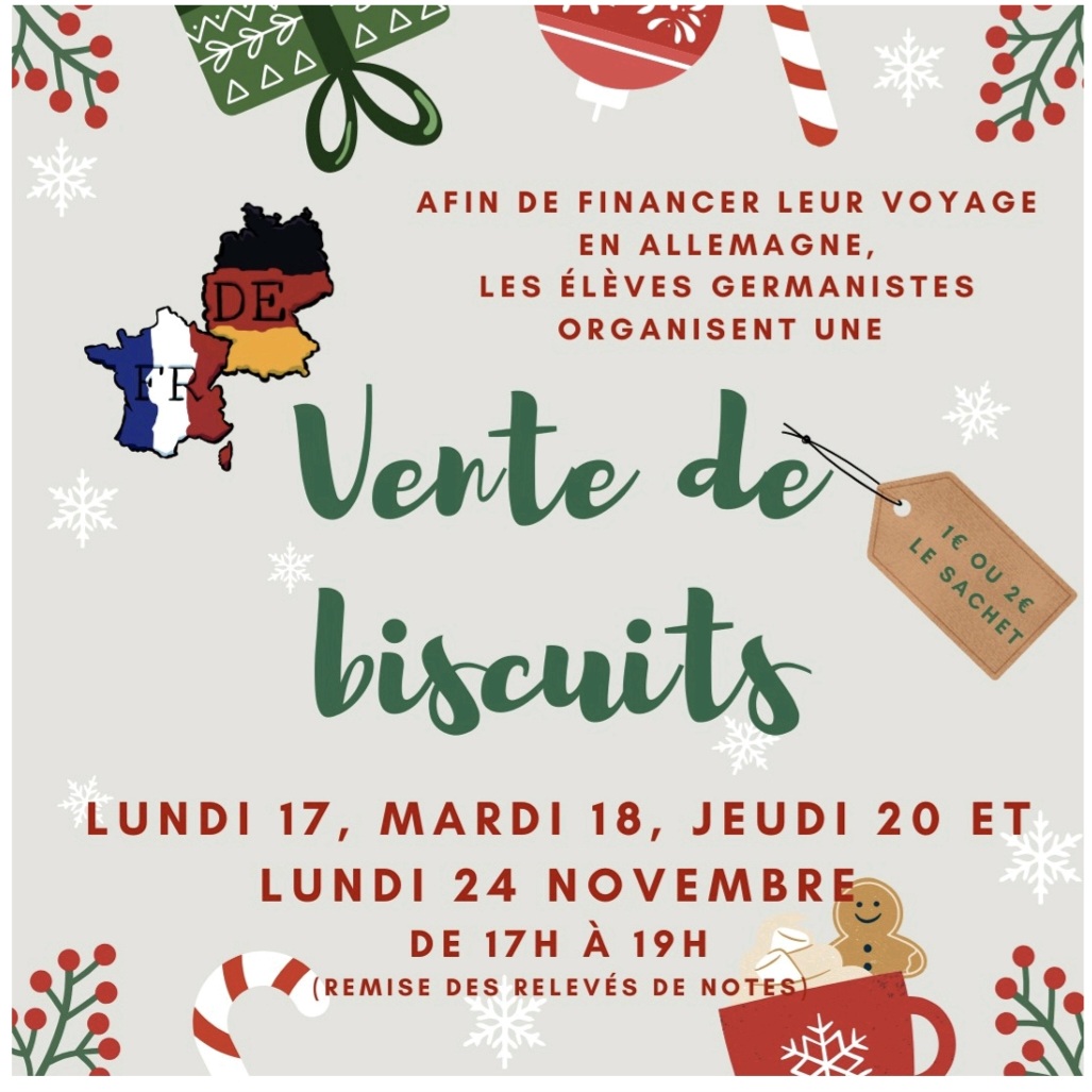 Afin de financer notre voyage en Allemagne, nous, élèves germanistes du collège Grange, vendrons des biscuits lors des remises des relevés de notes lundi 17, mardi 18, jeudi 20 et lundi 24 novembre. De petits et de grands sachets vous seront proposés, respectivement à 1€ et 2€ l'un.